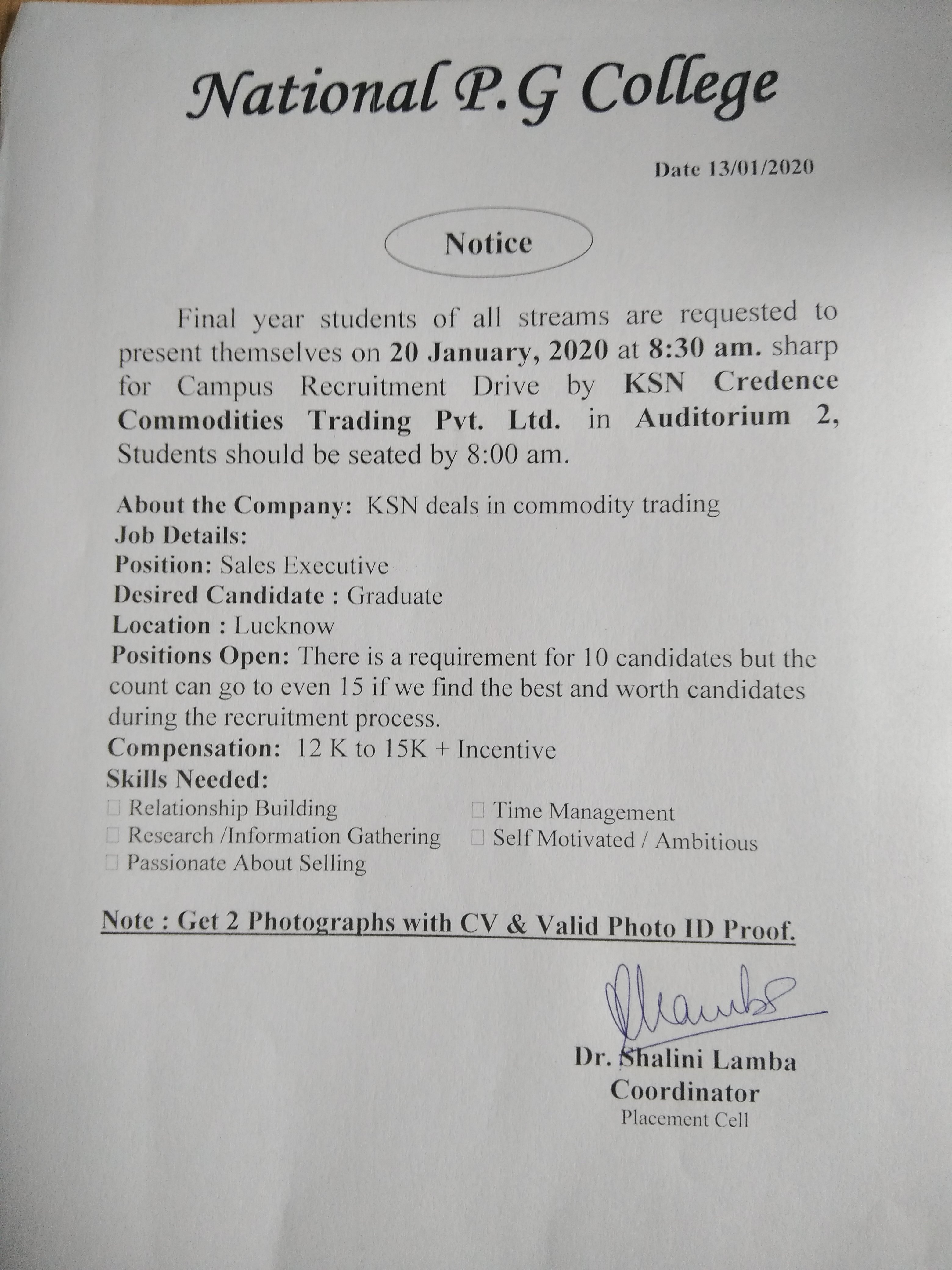 Placement Notice : KSN Credence Commodities Pvt. Ltd