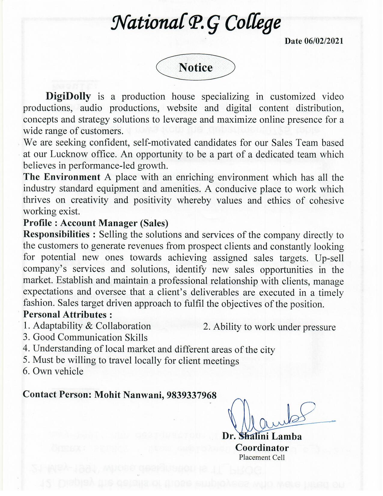 Placement Notice : DigiDolly Private Limited