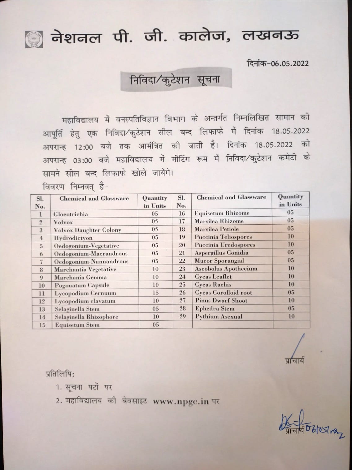 Tender Notice : Chemicals for Chemistry Lab