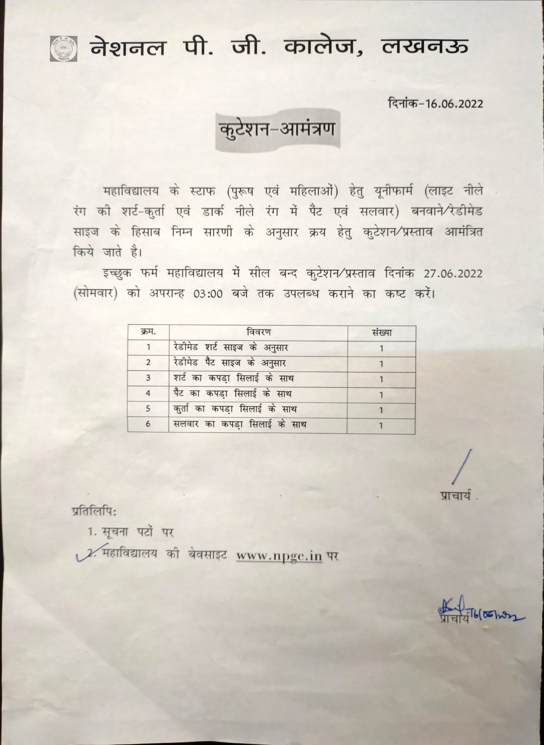 Tender Notice : Uniform Blazer for College Staff