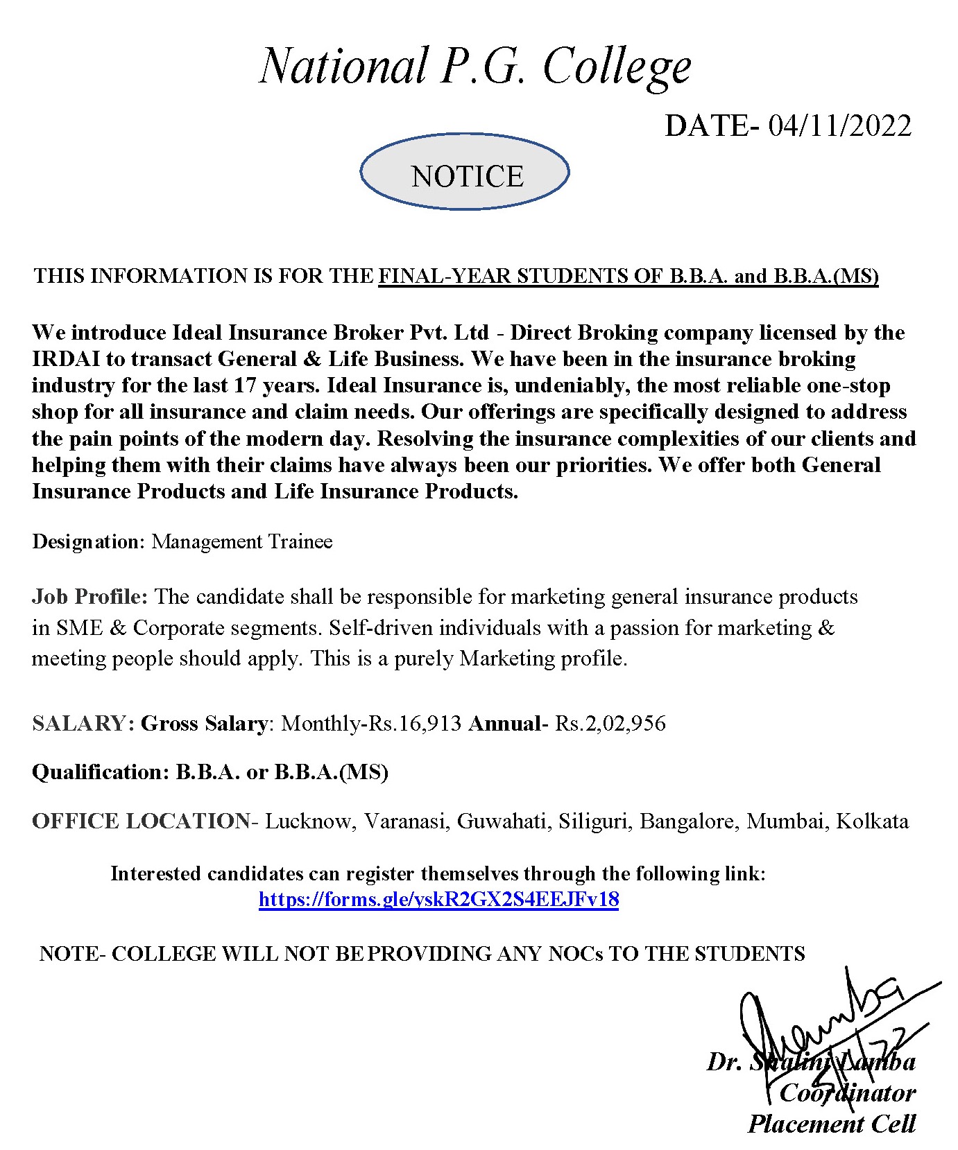 Placement Notice for Final Year Students