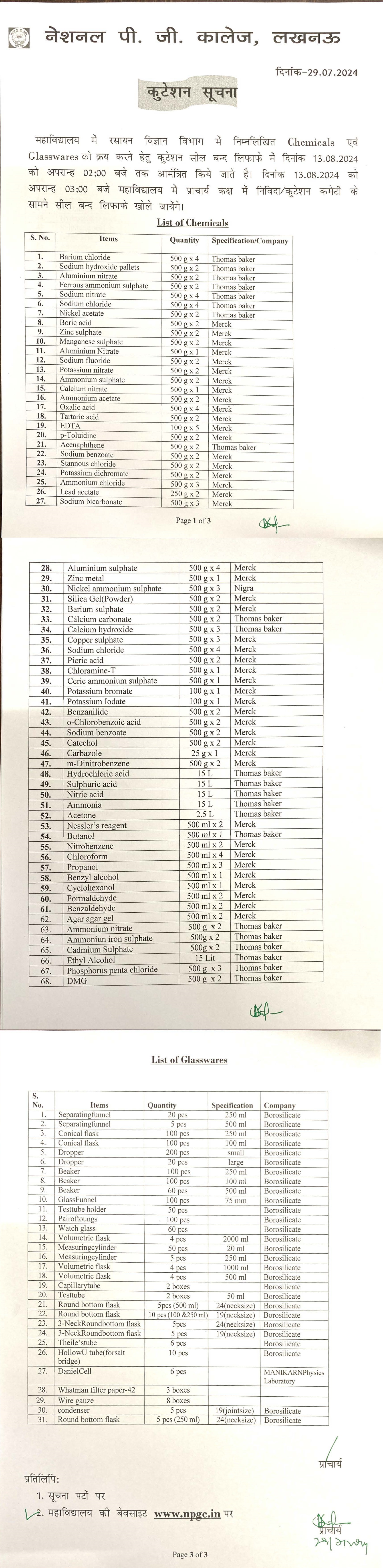 Requirement of Chemicals and Equipments in Chemistry Lab