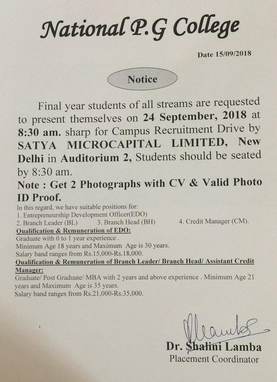 Placement Notice : Recruitment drive by SATYA MICROCAPITAL LIMITED